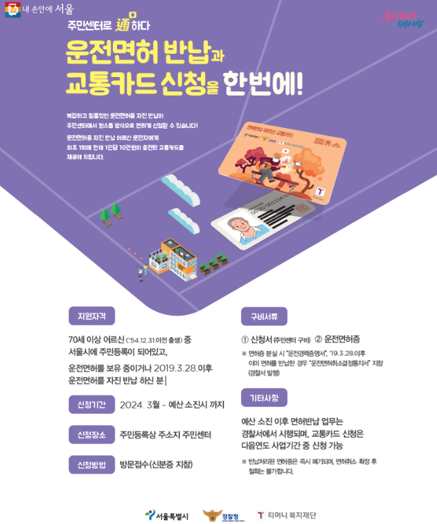그래서 서울시는 70세 이상 고령운전자들이 자발적으로 운전면허증을 반납하면 10만 원 상당의 교통카드를 지급한다고 합니다. 사실 작년에는 2만 8,700명에게 교통카드가 지급되기도 했습니다.