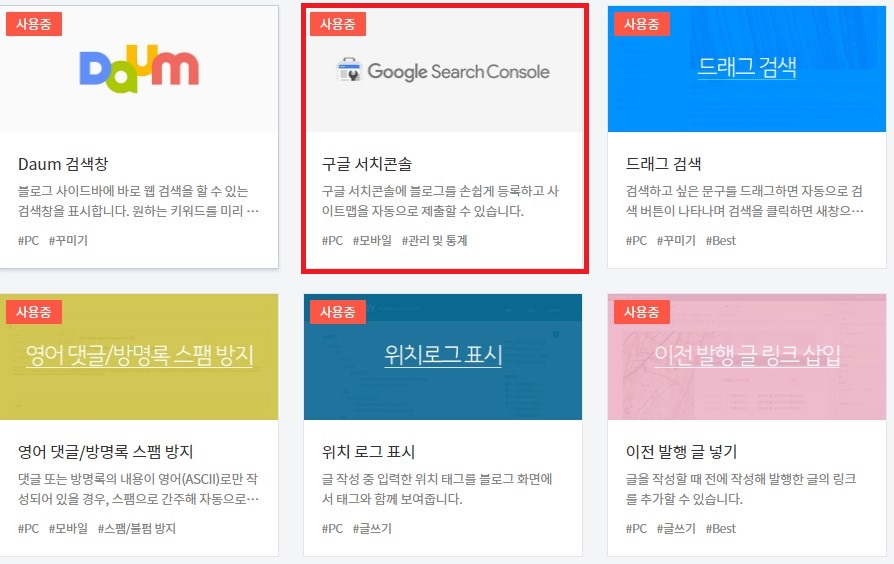 그래서 티스토리 안에 플러그인에서 구글 써치 콘솔을 연결시켜주는 걸 생각이 들어 바로 연결해 봤습니다. 티스토리 블로그 설정에 가면 '플러그인' 항목에서 확인할 수 있습니다.