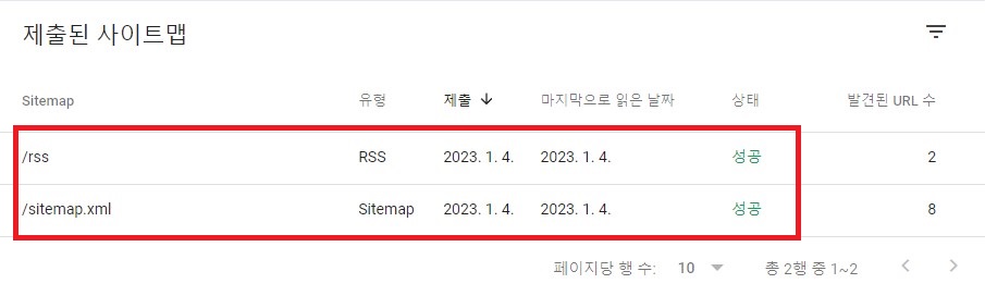 구글 써치 콘솔을 플러그인으로 연결시키고 나서 rss를 다시 제출했더니 밑의 사진처럼 '성공'이란 메시지로 화답을 받았습니다. 이제 내가 쓰는 글도 구글이 잘 읽어가겠죠! 저는 이걸로 하위도메인이 2개가 늘었습니다. 다들 열심히 포스팅해 봅시다!