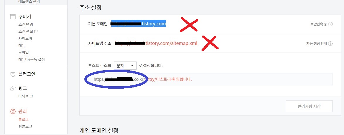 1. 구글써치콘솔에 등록하기 전에 하위 도메인 주소를 복사합니다. 밑의 사진에 X 한 부분처럼 티스토리(tistory)가 들어가 있는 주소 말고, 2차 도메인으로 만들어진 하위도메인 주소(밑의 사진 파란 색원)를 복사합니다.
