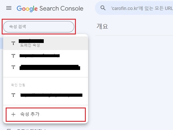 2. 구글 써치 콘솔에 로그인한 후에 좌측상단에 속성 검색 클릭하고 속성 추가까지 클립 합니다.