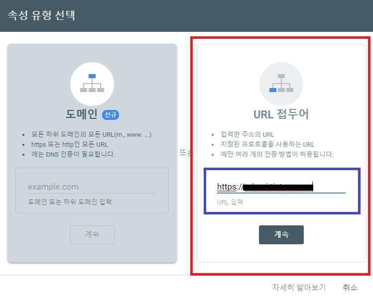 3. 밑의 사진처럼 뜬다면 우리는 오른쪽에 주소를 붙여 넣습니다. 왼쪽과 오른쪽의 그림만 봐도 왼쪽은 새로 추가, 오른쪽은 머리 밑에 가지 친 그림처럼 하위도메인을 상징하고 있습니다.