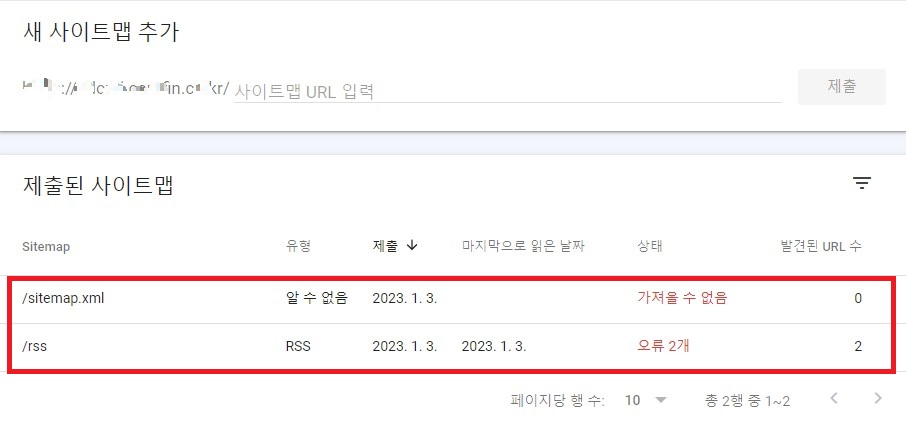 5. rss와 sitemap.xml이라는 단어를 각각 치고 제출합니다.