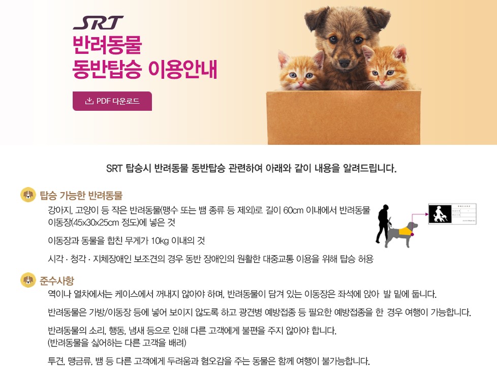 SRT도 KTX와 같은 방법으로 이동장안에 넣어 탑승이 가능합니다. 하지만 KTX와 기준과 조금은 다릅니다. 그래도 이동장의 크기(45cm*30cm*25cm)에 합하여야 하고, 반려동물의 크기가 60cm이내여야 합니다. 개인적인 생각이지만, KTX와 SRT에서 제시하는 이동장의 크기가 같은데, 왜 동물의 크기는 60cm 정했는지 이해가 안되네요. 반려동물이 조금이라도 답답해 하지 않게 하기 위함일지도 모르겠습니다. 즉, 60cm이내의 반려동물을 이동장(45*30*25cm)에 넣고, 총 합 무게가 10kg이내로 탑승이 가능합니다. 당연히 광견병 예방접종 등을 한 경우에만 가능한 조건입니다. 그리고 다른 고객들에게 불편함(소리, 행동, 냄새 등)을 주지 않기 위해 노력을 해야겠습니다.