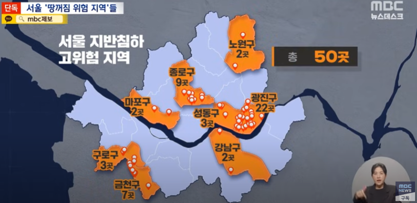 그래서 서울시에서 싱크홀 고위험 지역이라는 곳을 뉴스를 통해 알아봤는데요. 국토부에서 보고된 지역은 이렇습니다.