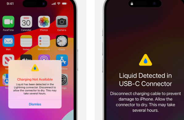 왼쪽은 충전단자가 액체를 감지한다는 표시를 띄우는 상태, 오른쪽은 충전기를 연결했을 때 액체가 감지되는 경우 띄우는 상태 메세지 입니다. 이 때는 즉시 분리해야 합니다.