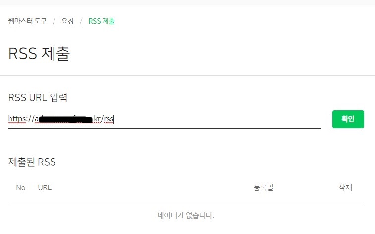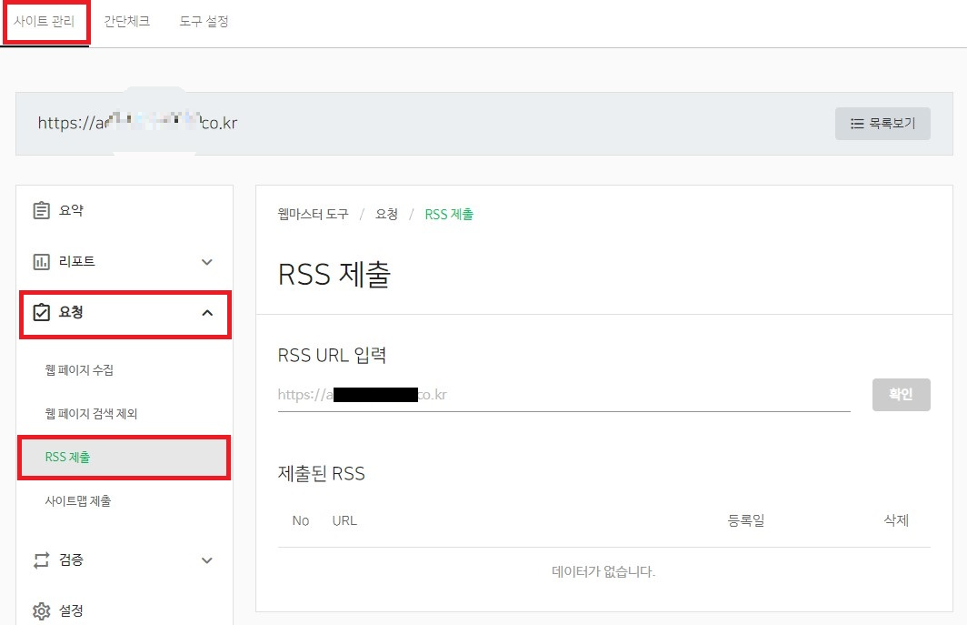 5. 사이트 등록 후에는 구글써치 콘솔에서 했듯이 rss와 사이트맵을 제출해야 합니다. 밑의 화면처럼 방금 등록 한 사이트를 클릭한 후 사이트 관리까지 클릭하고 요청탭에 rss제출을 클릭합니다. https가 포함된 주소와 /rss를 쓰고 확인, 그리고 밑의 칸에 사이트맵 제출까지 똑같은 방법으로 /sitemap.xml 확인까지 클릭합니다.