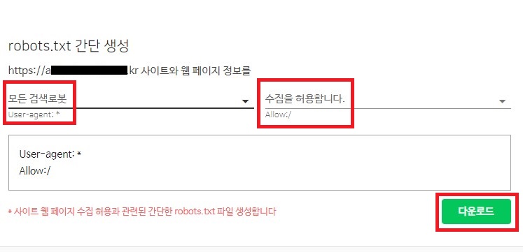 7. 그리고 하단에 네이버 로봇을 모든 검색 로봇으로 바꾸고 수집을 허용합니다까지 한 후에 다운로드 클릭합니다.