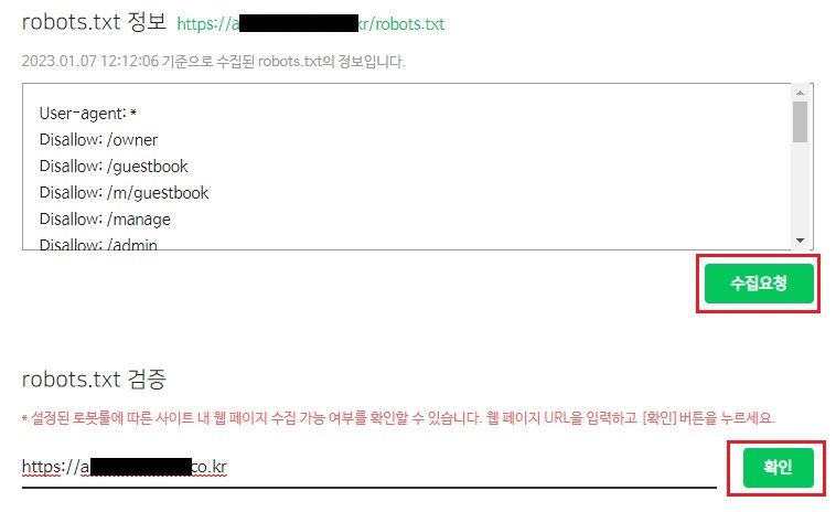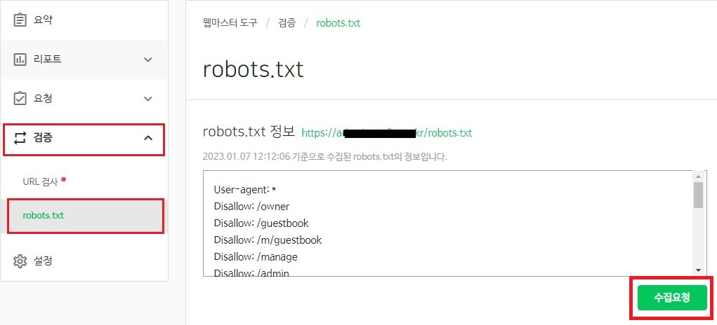 6. 아직 끝난 게 아니에요. 마무리 단계 여기까지 해야 네이버가 제 글을 검색해서 보여줍니다. robots.txt를 티스토리에 넣어줘야 합니다. 검증 탭에서 robots.txt를 클릭하고 수집요청을 누르고 확인 눌러주세요. 그리고 밑에 robots.txt 검증에 내 블로그 주소를 넣고 확인을 누릅니다.