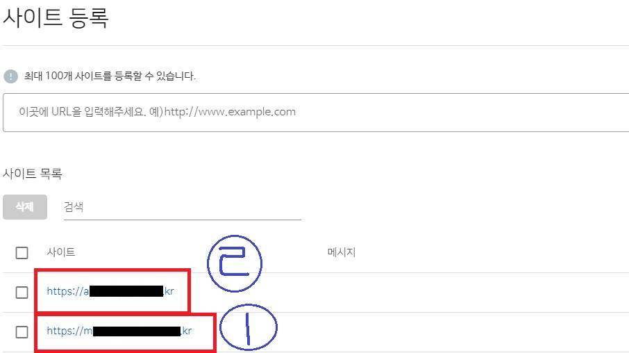 4. 3번을 완료 후에 보이는 화면이 밑의 화면입니다. 지금 포스팅하면서 제가 새로 등록한 사이트는 두 번째 사이트입니다.