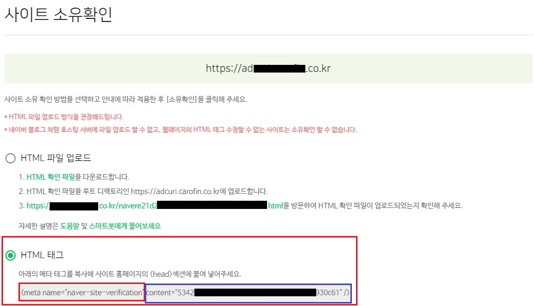 3. 사이트 등록 후, 소유 확인을 위해서 밑의 그림처럼 화면이 전환될 겁니다. 두 번째 칸에 'HTML 태그'를 누르시면 됩니다. 그리고 설명을 보고 그대로 따라 하시면 되는데, 여기서 2가지 방법이 있습니다.