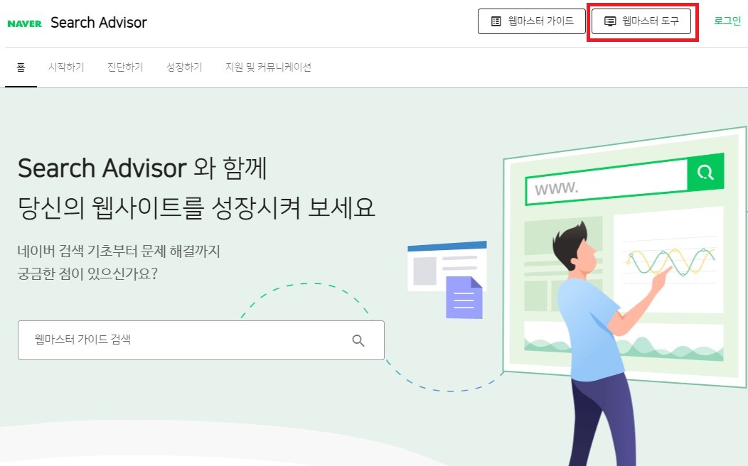 1. 네이버 써치 어드바이저로 가서 '웹마스터 도구'로 들어갑니다.