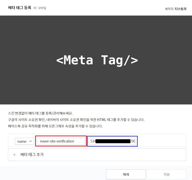 첫째는 HTML 태그를 그대로 복사해서 티스토리 html 편집으로 가서 <head> ~ </head> 사이에 넣는 것입니다. 두 번째는 티스토리 플러그인을 이용하는 방법이 있습니다. 밑의 그림처럼 티스토리 플러그인에서 메타 태그 등록(Meta Tag)을 클릭하고 name 옆으로 첫 번째 칸에는 meta name(빨간 네모), 두 번째 칸에는 content(파란 네모)를 붙여 넣기 해서 넣습니다.(" <-인용표는 제외). 그리고 완료하면 됩니다.