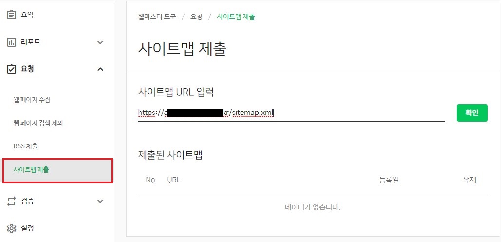 5. 사이트 등록 후에는 구글써치 콘솔에서 했듯이 rss와 사이트맵을 제출해야 합니다. 밑의 화면처럼 방금 등록 한 사이트를 클릭한 후 사이트 관리까지 클릭하고 요청탭에 rss제출을 클릭합니다. https가 포함된 주소와 /rss를 쓰고 확인, 그리고 밑의 칸에 사이트맵 제출까지 똑같은 방법으로 /sitemap.xml 확인까지 클릭합니다.
