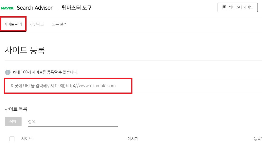2. 밑의 사진처럼 '사이트 관리' 클릭 후에 사이트 등록 밑에다가 자신의 블로그 주소를 입력해 주세요.