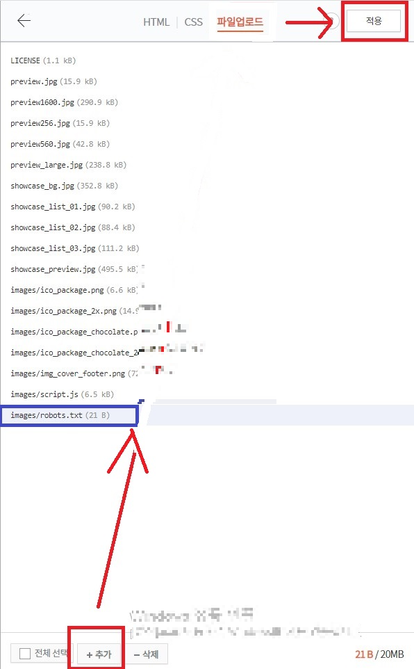 8. 티스토리에서 스킨 편집 누르고 html 편집을 누릅니다. 그리고 파일업로드 탭으로 가서 하단에 추가 버튼을 누르고 다운로드한 robots.txt 파일을 업로드시킵니다. 그리고 적용까지 눌러줍니다.