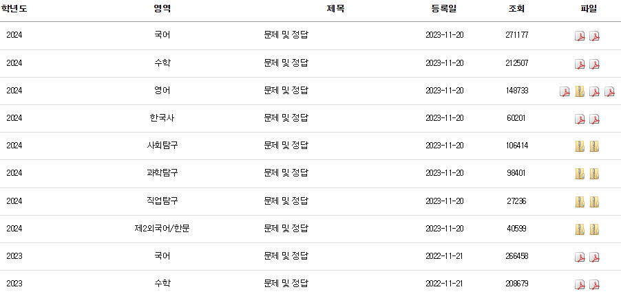 수능 당일까지는 문제와 정답지가 공개되지 않고 비밀리에 진행되기 때문에 해당 학년도 수험생들이 미리 볼 수 없습니다.